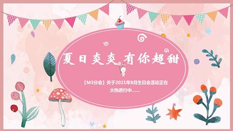 目的:为了增进员工之间的交流,让新员工更好融入、融创、融合,体现公司对员工的关怀,增强员工的归属感;增强凝聚力,培养员工忠诚品质;体现M3分会重视、关注每一个员工的成长。背景:为了体现M3分会对员工的关怀,增进员工对公司的认同及归属感,使广大员工真正的融入到M3分会这个大家庭中,进而保持更好的工作状态,时间如约 随期而至,M3分会约你一起过生日~参与本月生日会话题“夏日炎炎 有你超甜”的帖子下留言,可以分享工作及生活中的趣事、烦心事、生日愿望或夏日炎炎的感受等等;留言成功的寿星们即可在8月17日模组3号楼食堂门口处领取属于自己的生日礼品。此活动仅限M3分会8月69名寿星们参与哟~参与方式:在留言区回复留言格式:科室+工号+姓名+分享例如:后工程制造二科 30106495 徐天娇 疫情过后想上约三五个好友一起去好好浪一浪。活动留言截止时间:2021年8月16日00:00生日礼品领取时间:2021年8月17日11:00-12:30(模组3号楼食堂门口处领取)