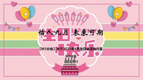 背景:秋风明月,人间九月,阳光正好,青春不老,未来的路,一切皆可期。为了增进员工之间的交流,让新员工更好融入、融合到M3这个大家庭中,体现公司对员工的关怀,增强员工的归属感;增强凝聚力,培养员工忠诚品质;体现M3分会重视、关注每一个员工的成长。目的:为了体现M3分会对员工的关怀,增进员工对公司的认同及归属感,使广大员工真正的融入到M3分会这个大家庭中,进而保持更好的工作状态。参与本月生日会话题“怡人九月