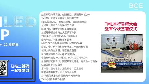 TM1举行誓师大会暨军令状签署仪式 战队牵引市场突破,创新转型,满销满产 4020+TM1举行誓师大会暨军令状签署仪式MLED业务CEO、TM1总经理、副总经理参会总经理、财务及企划进行了汇报明确了Q2-Q4经营目标及具体措施总经理带领全体与会人宣读军令状2022年10月起持续突破,持续盈利全力以赴,不达目标誓不罢休MLED CEO与TM1总经理现场签署军令状向前、中、后台组织授予战旗,明确目标任务领旗人员热血澎湃,誓言完成重任前台确保销量达标,Q4达到40Ksh+中台确保交付100%达成,BOM&BX下降20%后台做好支援工作,完成数字化建设,组织及人才确保CEO做出要求和指示全体同仁坚定信念,坚定目标,坚定落地雄关漫道真如铁,而今迈步从头越心怀感恩 坚定从容 苦炼内功 万马奔腾TM1必胜!MLED必胜!