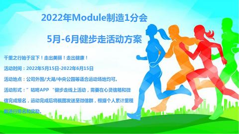【活动目的】 通过开展健步走活动可以增强员工体质,鼓励员工繁忙的工作之余,参与健步走活动,丰富员工的生活,促进制造1分会的凝聚力,号召大家迎难而上,上下同欲,齐心协力,全力以赴,助力公司经营目标达成贡献自己的一份力量!【活动主题】千里之行始于足下!走出美丽!走出健康!【活动时间、地点】 时间:2022.5.15-6.15; 地点:公司外围/大湖/中央公园等等适合运动场地均可。【宣导方式】 通过心灵信箱链接、部门内部微信群、邮件宣传。【活动方式】 本次为健步走线上活动。【参与范围】 Module制造1分会全体员工,皆可参加。